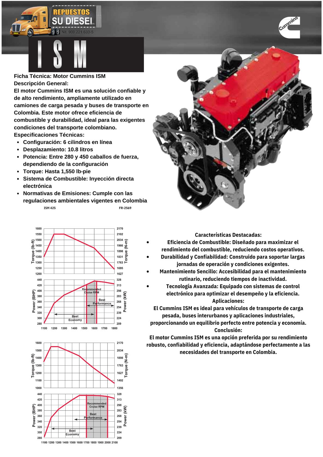 El motor Cummins ISM es un motor diésel de 6 cilindros en línea con una cilindrada de 10.8 litros, diseñado para aplicaciones de servicio pesado en camiones, autobuses, vehículos recreativos y equipos industriales.